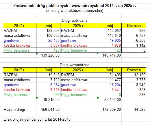 Zmiana ilości i nawierzchni dróg w latach 2027 - 2025
